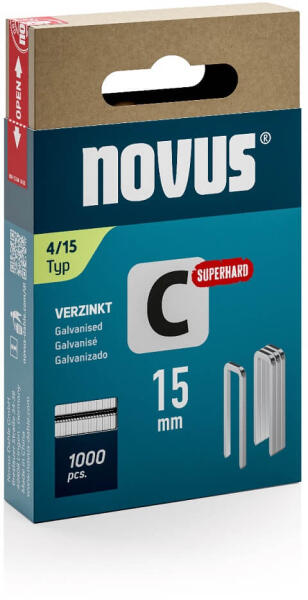 Novus Typ 4/15C keskeny tűzőkapocs profil fa, lábazat, panelek, farostlemez, drótháló rögzítéséhez. Fa és burkolási munkákhoz. A keskeny tűzőkapocs ideális kapocs a nehéz fa- és lambériázási munkákhoz - akár profilburkolati, akár anélkül. Tartós és erős, alkalmas többek között hornyolt lemezek, panelek, farostlemezek és drótháló rögzítésére.