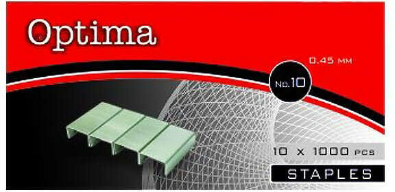 OPTIMA No. 10 Tűzőkapocs: 1000 db-os gazdaságos kiszerelés ? Az OPTIMA No. 10 tűzőkapcsok kiváló minőségű, horganyzott acélból készülnek, biztosítva a tartósságot és a megbízható teljesítményt. 1000 darabos kiszerelésben kaphatóak, így hosszú ideig elegendő mennyiséget biztosítanak az irodai vagy otthoni használathoz. Jellemzők:Méret: No. 10 Anyag: Horganyzott acél Darabszám: 1000 db (10 x 100 db-os doboz) Vastagság: 0.45 mm Alkalmas: Irodákba, otthoni használatra, stb. Előnyök:Gazdaságos: Nagy mennyiség kedvező áron. Tartós: Kiváló minőségű anyagból készültek. Megbízható: Tökéletesen működnek minden szabványos tűzőgéppel. Praktikus: 10 dobozban, könnyen tárolható.
